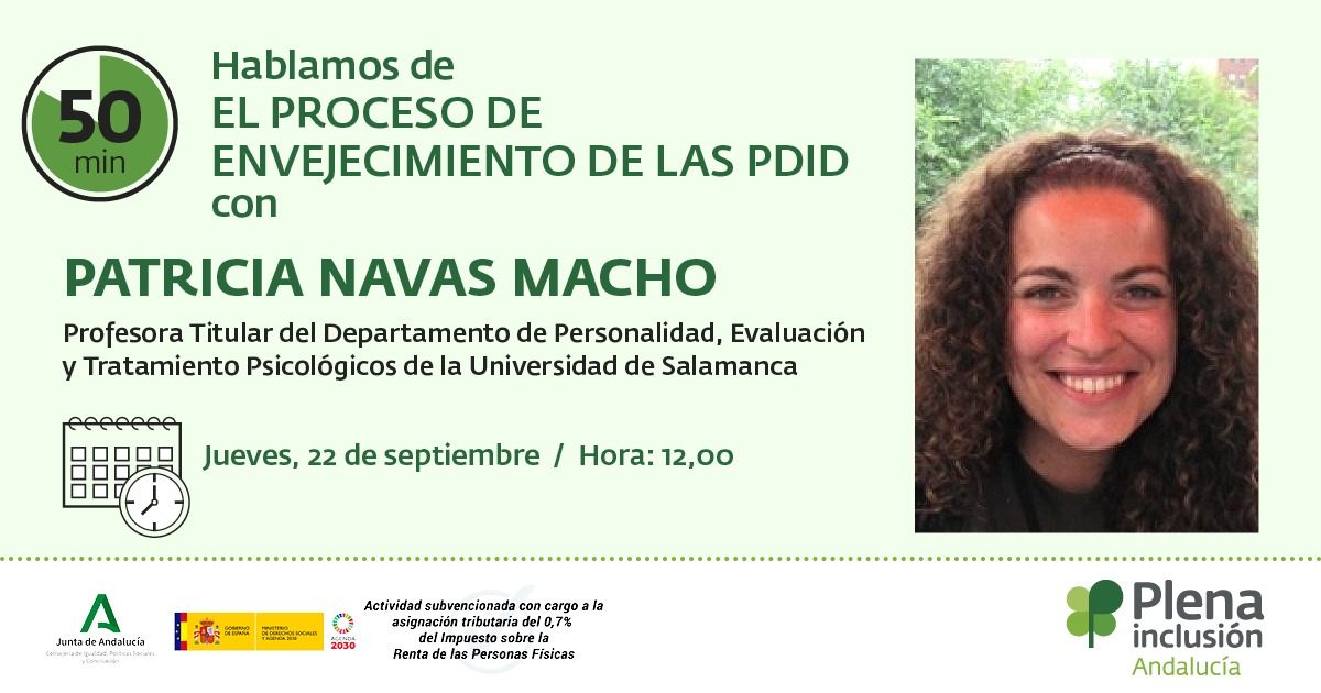 Plena inclusión Andalucía organiza un nuevo formato de 50 minutos para hablar sobre Envejecimiento de la mano de Patricia Navas, profesora titular del departamento de Personalidad, Evaluación y Tratamiento Psicológico de la Universidad de Salamanca. Navas es también miembro activo del Instituto Universitario de Integración en la Comunidad (INICO), forma parte del Grupo de Investigación Reconocido en Discapacidad de la Universidad de Oviedo y la Unidad de Investigación Consolidada UIC 115 de la Junta de Castilla y León. Además, ha participado en un total de 20 proyectos y contratos de investigación sobre discapacidades intelectuales y del desarrollo, dirigiendo seis de ellos centrados en envejecimiento y personas con grandes necesidades de apoyo.