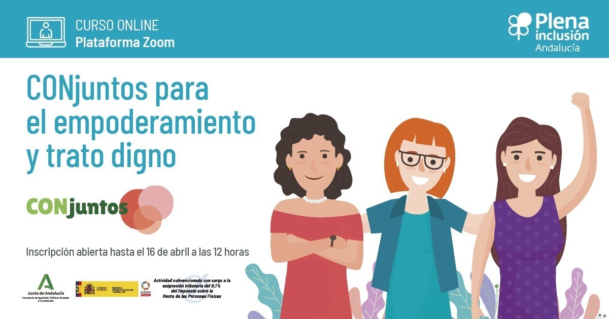 Plena inclusión Andalucía lanza la formación online ‘CONjuntos para el empoderamiento y trato digno’, que tendrá una duración de 24 horas y está destinada preferiblemente a tándem formados por profesionales (cualquier profesional que apoye a mujeres con discapacidad: cuidadores, monitores de taller, profesionales de programas de empleo, de apoyo a personas autogestoras, de familias, etc), mujeres con discapacidad y familiares.