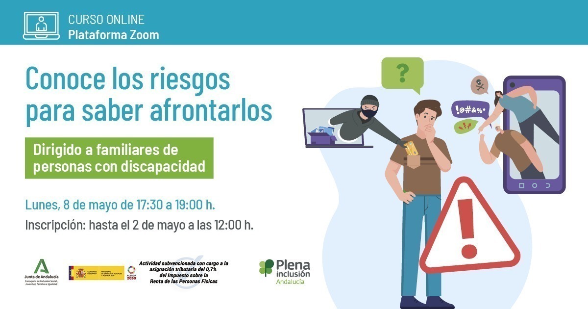 Plena inclusión Andalucía organiza la formación ‘Conoce los riesgos para saber afrontarlos’, que tendrá lugar el próximo lunes, 8 de mayo, de 17.30 a 19.00 horas de manera online, a través de la plataforma Zoom. La actividad está dirigida a familiares de personas con discapacidad intelectual y del desarrollo.