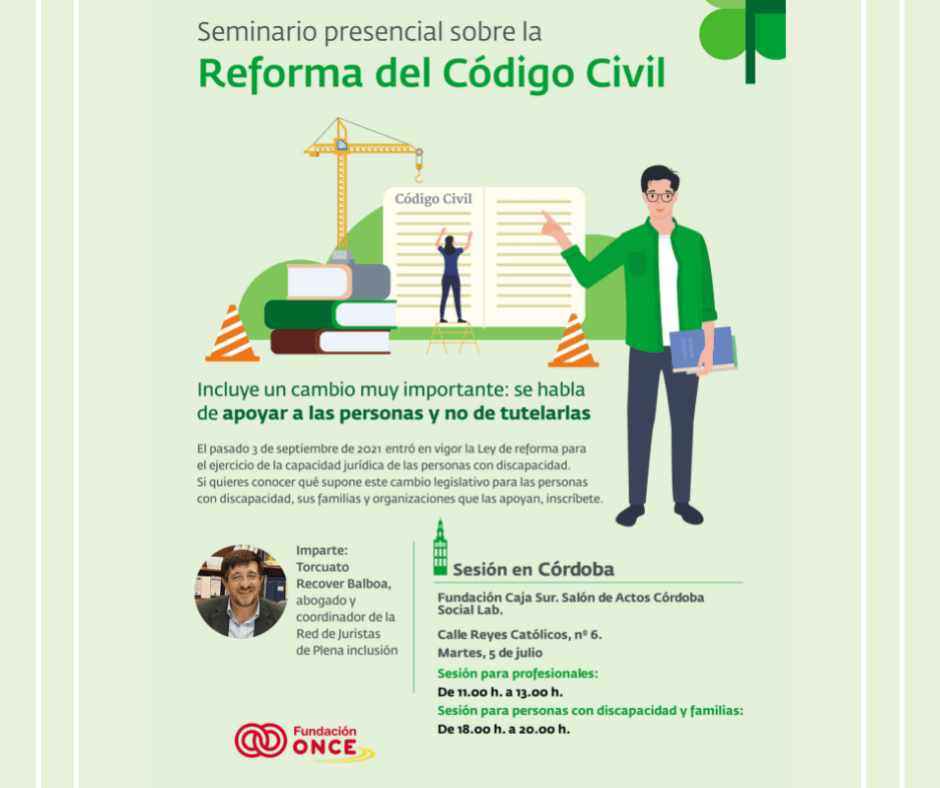 Plena inclusión Andalucía continúa ofreciendo seminarios presenciales sobre la reforma del código civil en distintas provincias de la comunidad andaluza. En esta ocasión el seminario tendrá lugar en Córdoba el próximo 5 de julio. Como los anteriores, la actividad contará también con dos jornadas diferenciadas para familiares y profesionales y nuevamente el seminario será dinamizado por Torcuato Recover, asesor jurídico de la federación y coordinador de la Red de Juristas de Plena inclusión España, que explicará qué supone este cambio legislativo para las personas con discapacidad y sus familias.