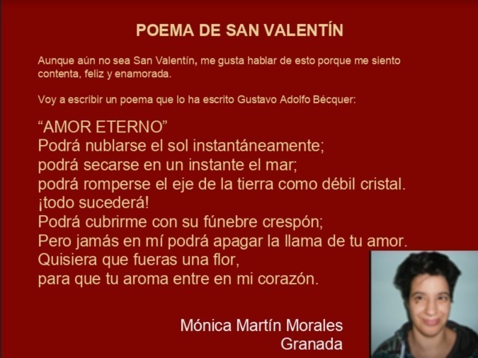 Ya que se acerca una fecha que se remarca con corazones, compartimos en nuestro #LosMartesTeCuento el poema que ha escrito Mónica Martín Morales, de la asociación granadina Asprogrades. «Poema de San Valentín» recoge los versos de uno de los grandes representantes de la poesía de nuestra tierra, Gustavo Adolfo Bécquer.