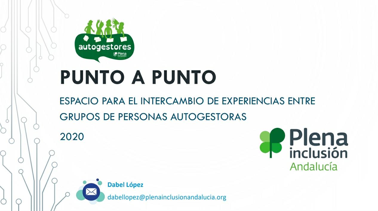 Plena inclusión Andalucía, desde el área de Ciudadanía Activa, propone el proyecto Punto a Punto, un espacio para el intercambio de experiencias entre grupos de personas autogestoras. Gracias a Punto a Punto, los autogestores podrán conocer qué actividades desarrollan otros grupos, afianzar los lazos y participar en actividades en la comunidad, contribuyendo al desarrollo de sentimiento de pertenencia a la misma.